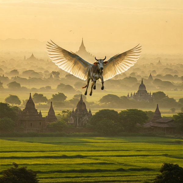 Sie sind ja so süß, die burmesischen Flugkühe. Sie sind ja auch so zutraulich. Wenn sich so eine burmesische Flugkuh an einen schmiegt und dabei lieblich vor sich hin schmatzt, dann kann man einfach nicht anders, dann muss man sie ein wenig kraulen. Dann legt sie sich auf den Rücken und lässt sich noch den Bauch streicheln. Wenn sie genug hat, springt sie auf, nimmt hopsend Anlauf und fliegt davon. So sind sie halt, die burmesichen Flugkühe, sie haben ihren eigenen Kopf.